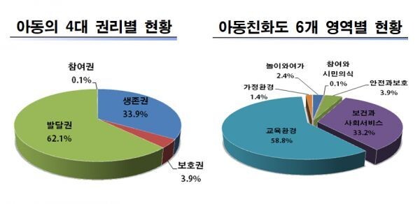 또한, 아동친화 예산을 아동친화도 6개 영역별로 분석한 결과, 전제 예산 중 교육 환경 분야가 가장 높은 비율을 차지하고 보건과 사회서비스 안전과 보호 놀이와 여가 가정환경 참여와 시민의식 순으로 나타났다.