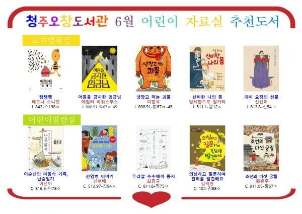 [무한뉴스] 청주오창도서관은 아동을 대상으로 한 이달의 추천도서로‘청렴도서’1권과 도서관 장서 특성화 주제인‘생활건강 도서’1권, 그리고‘아동 신간도서’8권을 포함한 총 10권을 선정했다.
