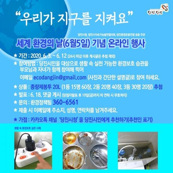 참여방법은 카카오톡 채널 ‘당진시청’에 가입한 후 해당 소식에 에너지절약, 수질보호 및 물 절약, 쓰레기 줄이기, 일회용품 안쓰기, 나무 한그루 심기 등 가정에서 실천할 수 있는 각종 환경보호 실천과제를 부모와 자녀가 함께하는 모습의 사진으로 찍어 간단한 설명과 함께 ecodangjin@gmail.com으로 전송하면 된다.