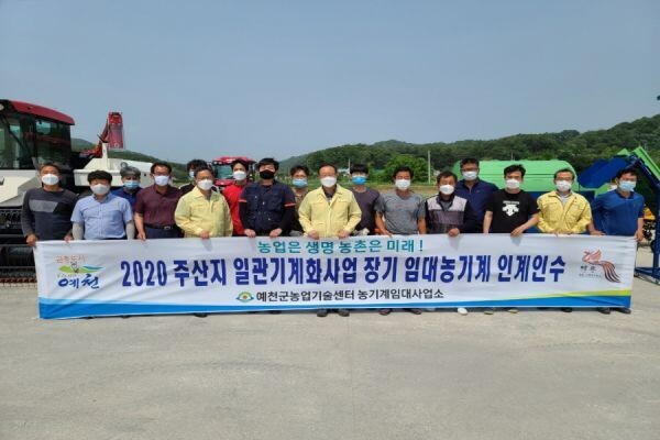 [무한뉴스] 예천군농업기술센터는 5일 오후 2시 농기계임대사업소에서 관내 3개 작목반 등 회원들이 참석한 가운데 주산지 일관기계화 장기임대 농기계 장기임대 약정 및 인계인수식을 가졌다.