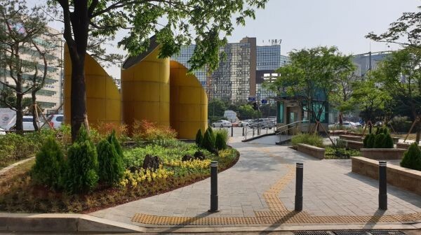 기존 녹지대 안에 있는 소나무 등 5종 264본의 수목을 다시 활용해 배치하고 휴식공간에는 앉음벽을 설치해 지하철 이용자와 인근 주민들에게 쉼터를 제공한다.