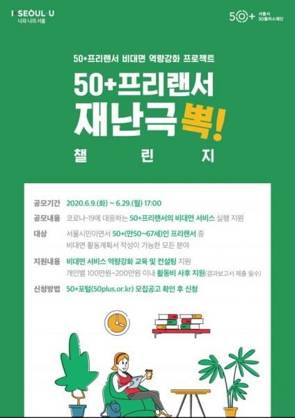 이에 서울시50플러스재단은 50+프리랜서들이 포스트 코로나 시대의 일자리 환경변화에 대응할 수 있도록 ‘50+프리랜서 비대면 역량강화 프로젝트’를 진행한다.