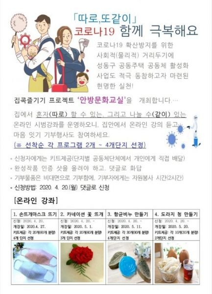 단지별 소개 동영상을 제작해 ‘온라인 상견례’를 시작하고 12개 단지는 시범적으로 ‘안방문화교실’을 운영하며 손뜨개 마스크 만들기, 항균비누·도라지청 만들기 등의 강좌를 온라인으로 진행했다.