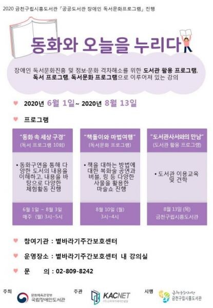 [무한뉴스] 금천문화재단은 금천구립시흥도서관이 ‘2020년 공공도서관 장애인 독서문화프로그램’ 수행 도서관으로 선정, 발달장애인을 대상으로 ‘동화와 오늘을 누리다’ 강좌를 운영한다고 밝혔다.