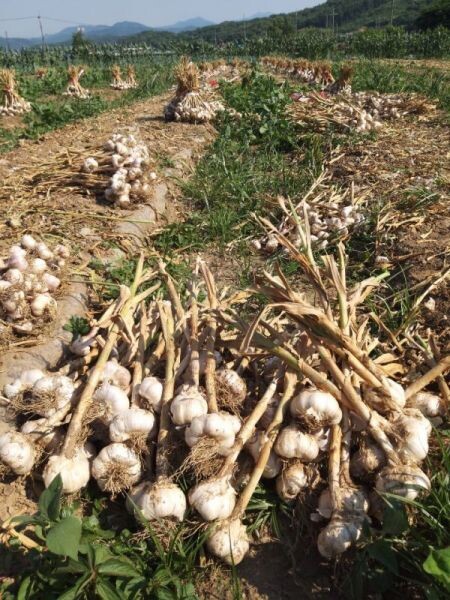 마늘은 수확 후 주대를 3~5cm 정도 남기고 절단한 후 그물망에 넣어 출하 하고 자연건조는 수확 직후 바람이 잘 통하는 곳에 2~3개월 말려야 한다.