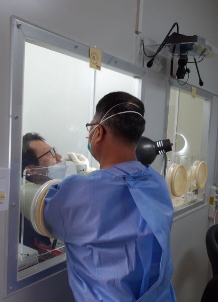 중앙에 아크릴 벽을 두어 의료진과 검사대상자의 공간을 분리하고 장갑이 달린 구멍을 통해 검체를 채취하도록 만든 '의료용 분리벽', 일명 '글로브월'은 의료진이 맞은편 검사대상자와 직접 접촉할 필요가 없어 검체채취시 감염을 예방하며 냉방 운영시에도 교차감염을 최소화할 수 있다.