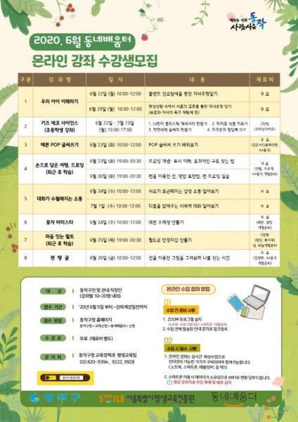 특히 올해는 코로나19 지역사회 전파를 방지하고자 6월 22일부터 7월 13일까지 ‘온라인 동네배움터’를 운영한다.