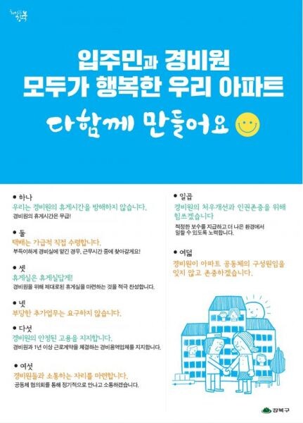 또한 ‘강북구 공동주택 관리 조례’를 개정해 경비원의 인권보장과 복지증지의 노력 등을 규정했다.