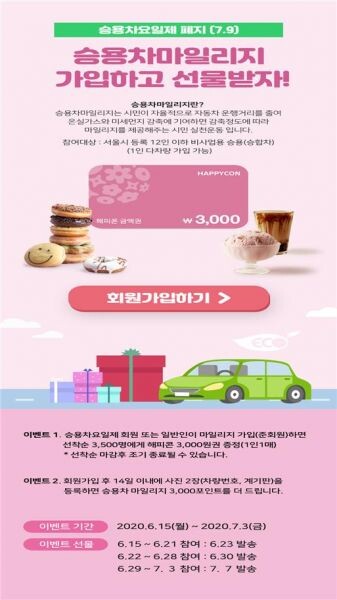 오는 15일부터 7월 3일까지 기존 요일제 회원이 마일리지제로 전환하거나, 일반시민이 신규로 마일리지에 가입하면 선착순 3,500명에게 3,000원 상당의 모바일 상품권을 증정한다.