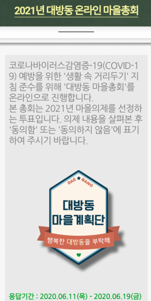 올해는 특히 코로나19 감염병 지역사회 확산을 방지하고자 마을총회를‘온라인 투표’와 ‘찾아가는 거점투표 방식’으로 진행한다.