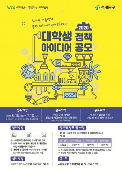 문석진 서대문구청장은 “처음엔 사소해 보이는 아이디어도 나중엔 큰 변화를 만들 수 있다”며 “친구들과 삼삼오오 모여 나누는 이야기들도 얼마든지 훌륭한 제안이 될 수 있는 만큼 많은 대학생들의 적극적인 참여를 기대한다”고 밝혔다.