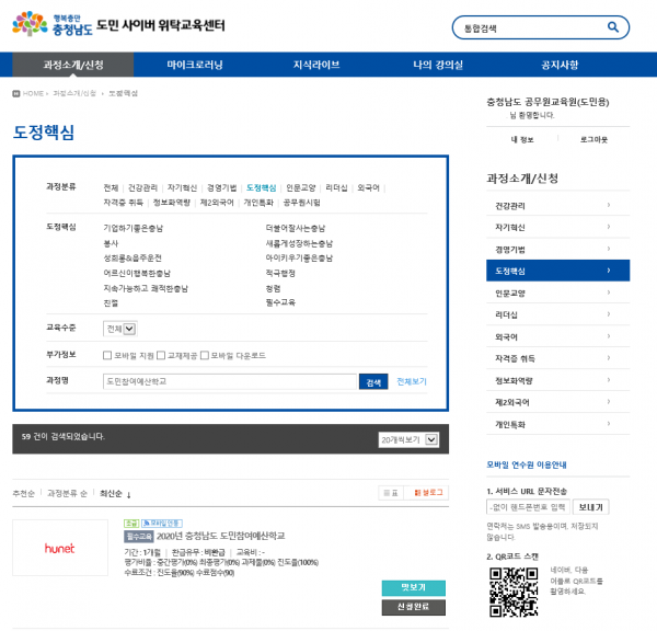 수강을 원하는 도민들은 충남공무원교육원 홈페이지 접속 → 교육과정 안내 → 도민용 사이버교육과정 접속 → 도정핵심 분야 → ‘도민참여예산학교’ 과정 검색 후 강의를 신청하면 된다.