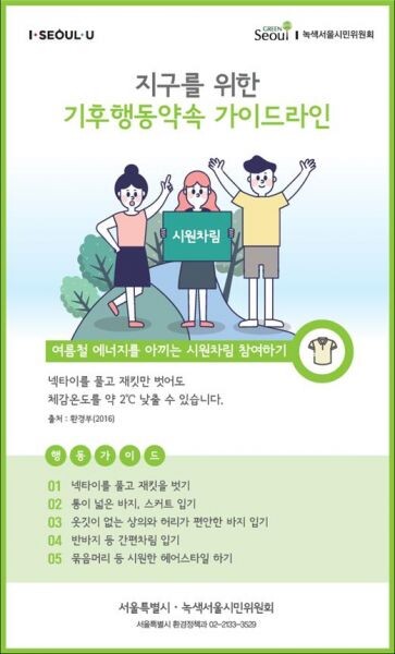 출처:한국기후환경네트워크 이동률 서울시 환경정책과장은 “실내온도 조절하기, 손수건 사용하기 등 시민들의 작은 습관이 온실가스를 줄이는 큰 움직임이 된다”며 “시원차림 등 기후변화 대응 습관 캠페인에 많은 시민이 참여할 수 있는 기회를 만들어 가겠다”고 말했다.