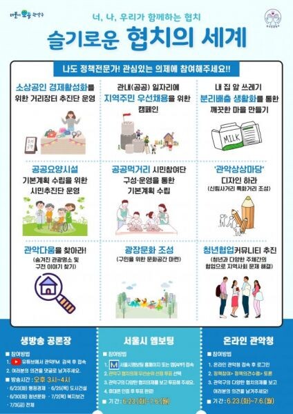 [무한뉴스] 관악구가 주민들의 의견을 청취하기 위해 협치 위원과 함께하는 온라인 숙의 공론장 ‘슬기로운 협치의 세계’를 개최한다고 밝혔다.