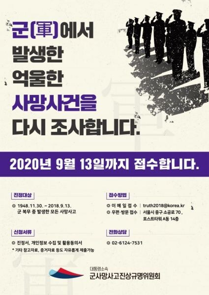 또한 군은 진정 접수 기한이 오는 9월 13일로 3개월도 채 남지 않았기 때문에 관내 유가족이 접수 시일을 놓쳐 신청을 하지 못하는 사례가 없도록 관내 홍보 활동을 강화할 계획이라고 전했다.