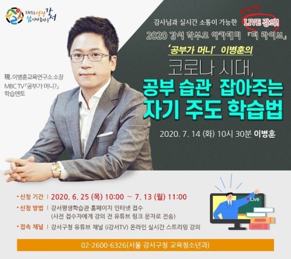 ‘강서 학부모 아카데미 ‘더 라이브’’는 7월 14일 10시 반부터 12시까지 유아 및 초·중·고등학생 자녀를 둔 관내 학부모를 대상으로 ‘강서구청 유튜브’를 통해 실시간 온라인으로 진행한다.
