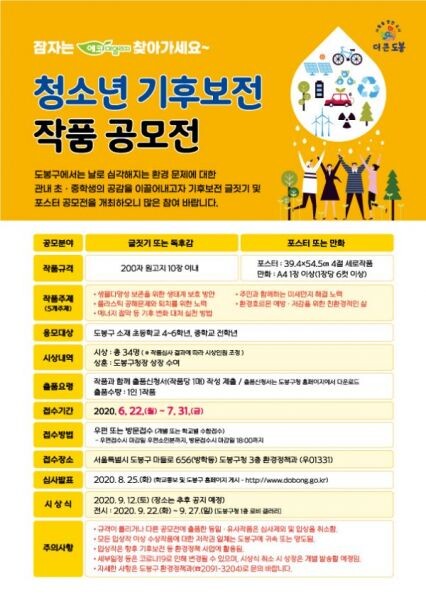 기후 변화 방지를 위한 우리의 실천 방법 등 다양한 주제로 도봉구 소재 초등 4~6학년생과 중학생이면 누구나 응모 할 수 있다.