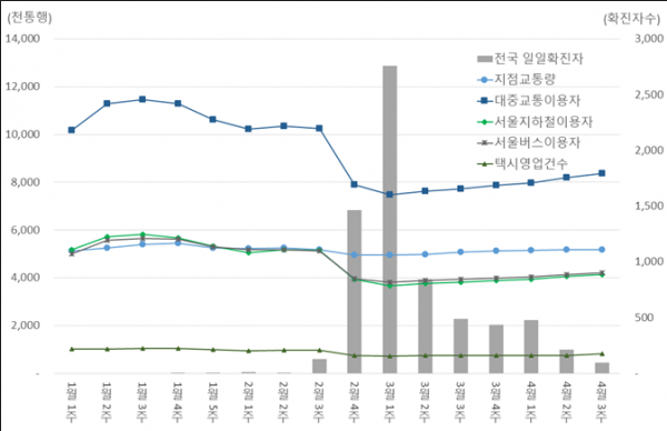 특히 도로교통량과 마찬가지로 전국 확진자가 급증한 2월 4주~3월 1주 감소율이 가장 컸다.