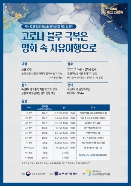 [무한뉴스] 금천문화재단은 금천구립독산도서관이 ‘2020년 도서관길 위의 인문학’ 자유기획 부문 운영 지원관으로 선정, 오는 7월부터 9월까지 ‘코로나 블루 극복은 명화 속 치유여행으로’ 프로그램을 운영한다.