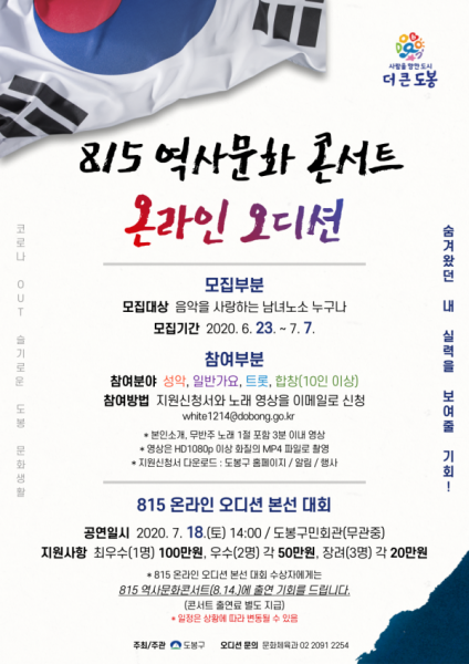 이동진 도봉구청장은 “이번 ‘815 역사문화콘서트 온라인 오디션’ 개최를 통해 숨어 있는 구민 여러분들의 끼와 재능을 펼칠 수 있는 기회가 되길 바라며 코로나19 장기화로 문화생활의 제약이 많은 요즘, 구민들이 직접 참여하며 스트레스를 날릴 수 있는 힐링의 시간이 되길 바란다”고 말했다.