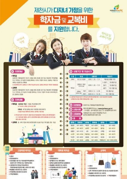 본 사업은 제천시에 3년 이상 계속해 주민등록을 두고 셋 이상의 자녀를 양육하고 있는 다자녀 가구를 대상으로 고등학교 1학년 자녀와 대학교에 재학 중인 자녀의 학자금을 지원해주는 사업으로 출생 순서와는 상관없이 지원한다.