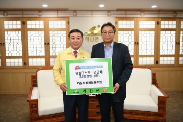 황선봉 군수는 "코로나19 극복을 위해 후원해 주신 다울사회적협동조합 직원분께 감사드린다"며 "예산군에서도 코로나19 지역확산 방지와 방역에 최선을 다하겠다"고 말했다.
