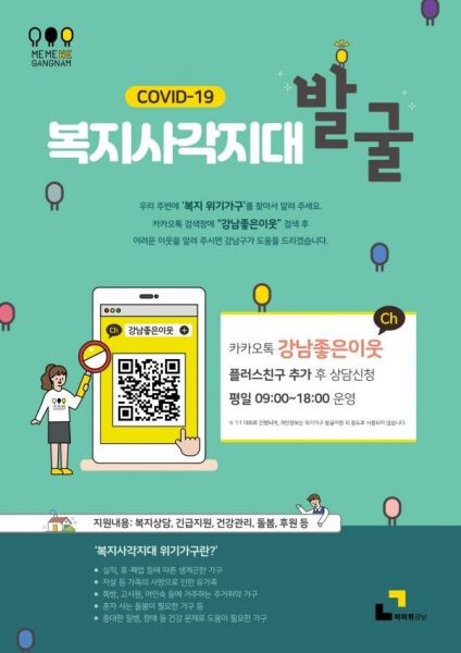 또 복지플래너, 우리동네돌봄단, 복지통반장 등이 집집마다 홍보에 나서는 한편 문자 및 전화, 카카오톡 채널 ‘강남좋은이웃’ 등으로 비대면 발굴도 강화한다.