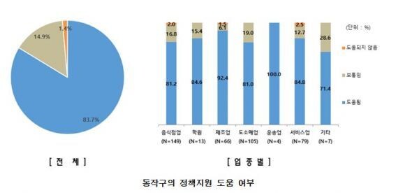 또한, 지원정책별 사업 필요성 조사 결과에서는 긴급생활 안정자금, 착한소비운동 등으로 나타났으며 지원사업 규모에 대한 만족도는 긴급생활 안정자금, 다중이용시설휴업 지원금 등의 순이다.