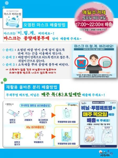 아울러 구는 코로나19 상황으로 인해 주민의 마스크 폐기물 발생량이 증가함에 따라 오염된 마스크를 통한 2차 감염 방지를 위해 ‘오염된 마스크 올바른 분리배출’ 방법을 안내 및 홍보하고 있다.