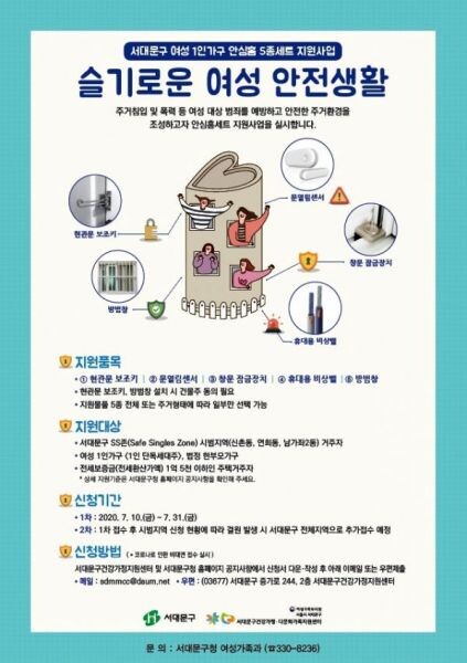 지원 대상은 서대문구 SS존 시범 지역인 신촌동, 연희동, 남가좌2동의 주택, 빌라, 원룸 밀집지역에서 전월세로 거주하는 여성 1인가구와 법정 한부모가구다.