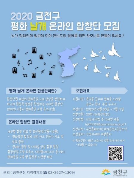 [무한뉴스] 금천구가 주민들의 평화 감수성 제고를 위한 ‘평화 날개 프로젝트’의 일환으로 평화 날개 온라인 합창단원 20명을 모집한다.