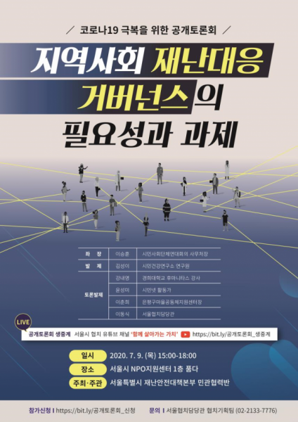 토론회는 재난대응 민관협치 선도적 사례라고 할 수 있는 서울시 재난안전대책본부 민관협력반에서 주최한다.