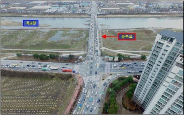 충무교 재가설 사업은 권곡동 충무교차로와 염치읍 석장리 석정교차로 간 0.94km를 6차로 확장하는 사업으로 2021년 공사 착공해 2024년 완료 예정이다.