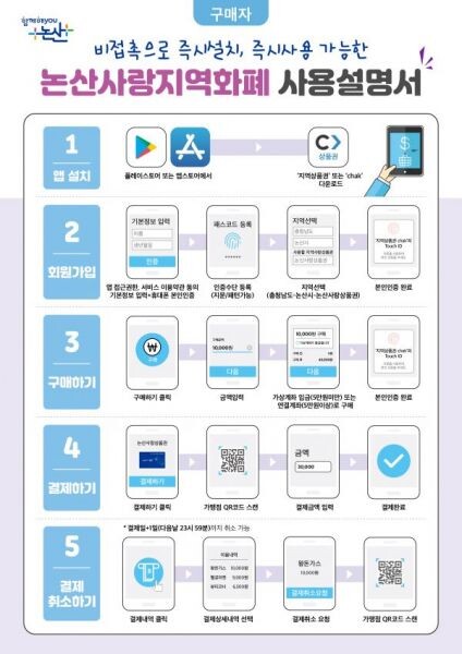 이용 방법은 스마트폰에 ‘지역상품권 Chak’앱을 다운받아 지역화폐를 구입한 뒤 QR코드를 통해 가맹점에서 결제가 가능하며 현금영수증을 자동으로 발급해 소득공제 혜택까지 받을 수 있다.