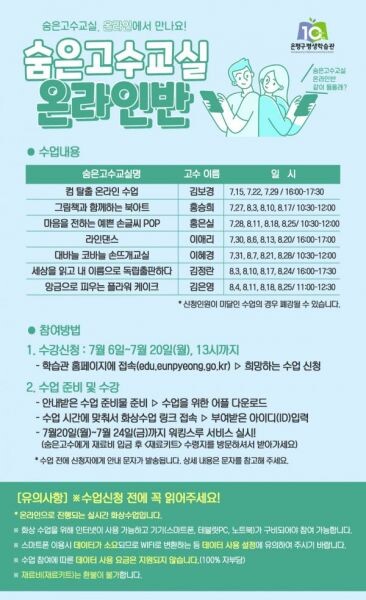 새롭게 모집하는 ‘숨은고수교실 온라인반’은 양질의 콘텐츠 제공과 양방향 소통 강화를 위해 다회차로 운영되며 7월 6일 ~ 7월 20일 오후 1시까지 은평구평생학습관 홈페이지를 통해 신청할 수 있다.