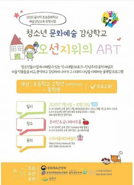 이용진 금천문화재단 대표이사는 “코로나19로 인해 음악과 미술에 열정 있는 학생들의 교육이 원활하게 진행될 수 없음에 안타까웠다”며 “이번 비대면 교육을 계기로 전형적인 문화예술 교육 방식을 탈피하고 다각도의 교육방식으로 지역 문화예술 발전에 한걸음 다가서겠다”고 말했다.