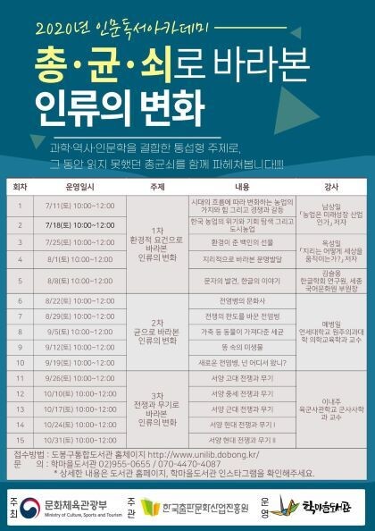 도봉문화재단 관계자는 “이번 강연은 코로나19로 인한 문화적 갈증을 느끼고 있을 우리 구민들에게 반가운 소식이며 이번 인문독서아카데미 사업으로 인문학은 물론 독서문화 증진에도 많은 도움이 되었으면 좋겠다”고 전했다.