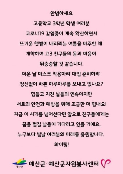 [무한뉴스] 예산군자원봉사센터는 코로나19로 인한 등교개학과 수능 연기로 지친 관내 7개교 724명의 고등학교 3학년 학생들에게 덴탈마스크를 포함한 응원키트를 전달했다고 13일 밝혔다.
