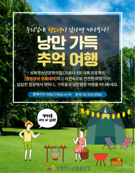 이에 따라 성북청소년문화의집에서는 ‘코로나 블루’ 극복 사업의 일환으로 7월부터 9월말 까지 한국스카우트연맹의 지원을 받아 캠핑 장비를 무료로 지원해 주는 진행할 예정이다.