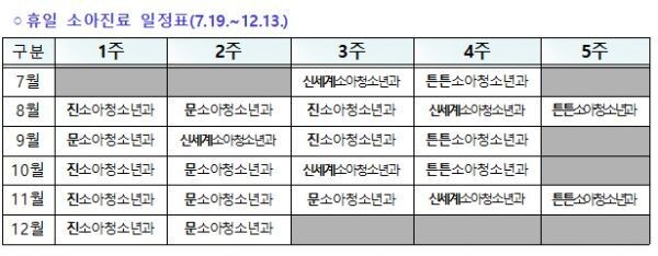 매주 지정된 소아청소년과의원 1곳은 일요일 오후 1시부터 6시까지 진료를 하고 이에 따라 소아환자는 휴일에도 안심하고 지정된 소아전문 의료기관에서 진료를 받을 수 있게 된다.