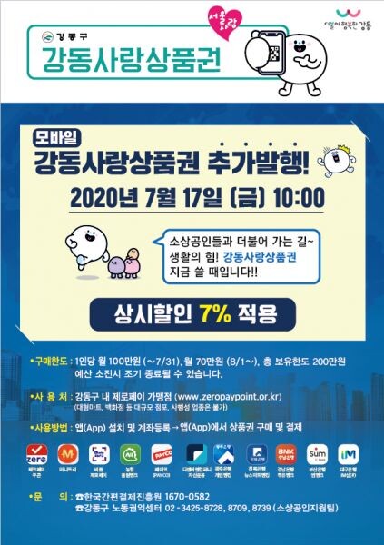강동구가 신종 코로나바이러스 감염증로 위축된 지역경제를 살리기 위해 강동사랑상품권을 오는 7월 17일 10시부터 판매한다.