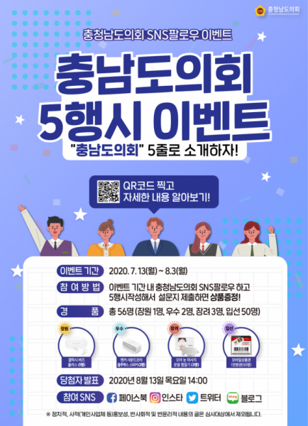 참여 방법은 도의회 페이스북과 인스타그램, 블로그 등 누리소통망을 구독한 후 제시어인 ‘충남도의회’로 오행시를 지어 행사 게시글 내 인터넷 연결주소로 제출하면 된다.