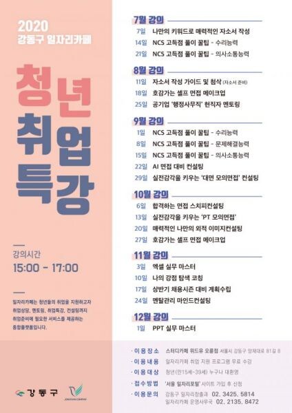 7월부터 본격적으로 시작되는 청년취업특강 프로그램은 자소서 작성 가이드 및 첨삭 호감가는 셀프 면접 메이크업 NCS 고득점 풀이 꿀팁 합격하는 면접 스피치컨설팅 등 다양하게 구성되어 있다.
