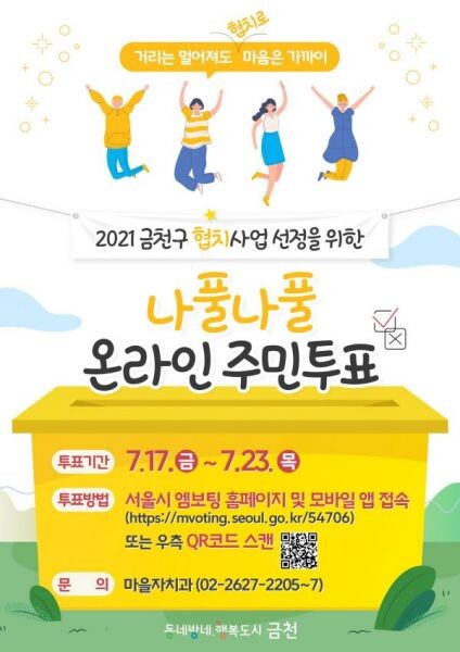 [무한뉴스] 금천구가 7월 17일부터 23일까지 7일간 2021년 금천구 협치 사업을 선정하는 ‘나풀나풀 온라인 주민투표’를 실시한다.