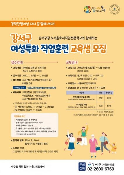 구는 취업과 창업을 준비하는 여성들을 대상으로 ‘강서구 여성특화 직업훈련 과정’을 개설하고 참가자를 모집한다.