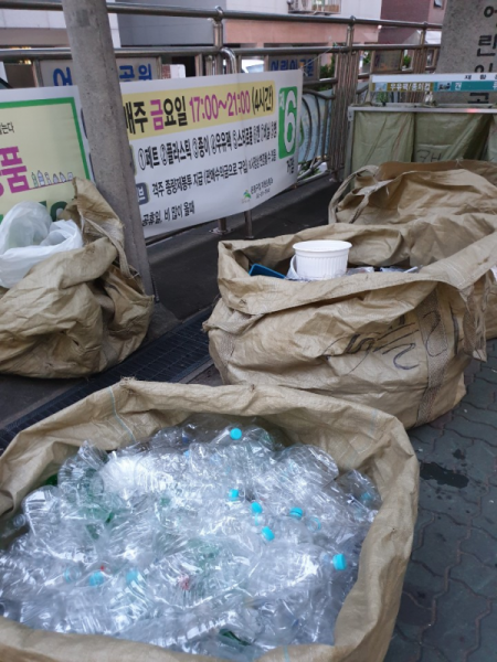 [무한뉴스] 마을공원 한 켠으로 모여드는 사람들의 손에는 폐트병, 폐지, 병 등 낯익은 재활용품들이 들려 있다.