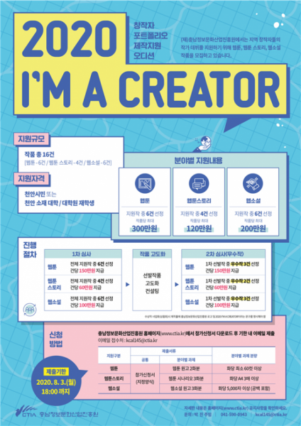 [무한뉴스] 천안시와 충남정보문화산업진흥원이 다음달 8월 3일까지 웹툰·웹툰스토리·웹소설 포트폴리오 제작지원 사업에 참여할 지역 창작자를 모집한다.