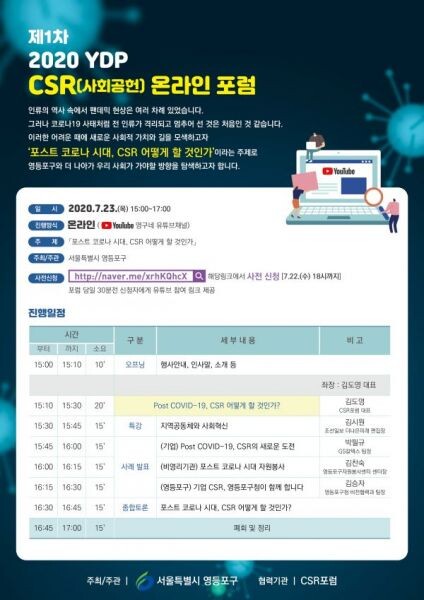 지역공동체와 사회혁신 포스트 코로나, CSR의 새로운 도전 포스트 코로나 시대의 자원봉사 기업 CSR, 영등포구청이 함께한다 등의 주제를 다룰 예정이다.