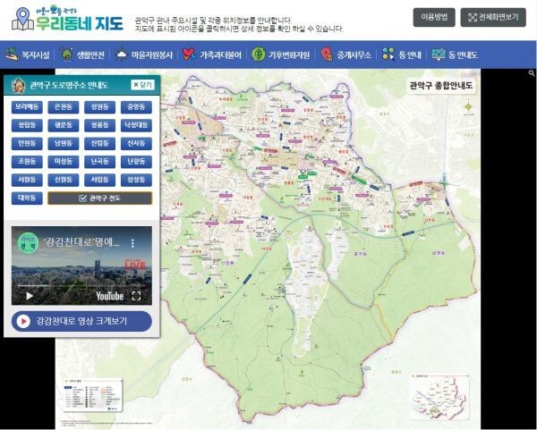 동 안내도 홈페이지에 드론으로 항공 촬영한 관악구 명예도로 강감찬대로(시흥IC~사당역) 홍보영상도 게재해 주민에게 볼거리를 제공한다. 영상은 관악구 유튜브 채널에서 “강감찬대로”를 검색해서 볼 수도 있다.