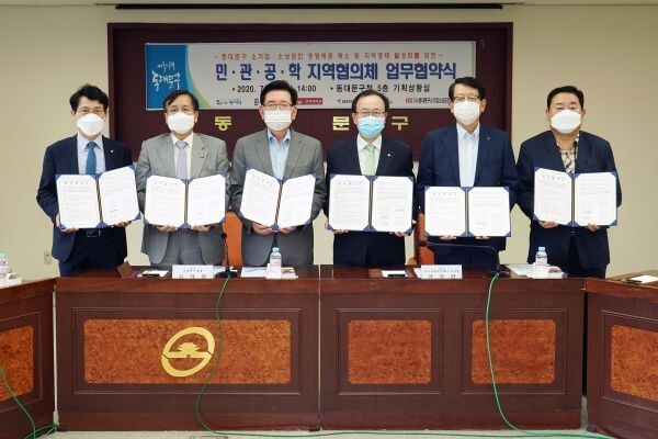 구는 20일 오후 2시 동대문구청 기획상황실에서 유덕열 구청장, 한종관 서울신용보증재단 이사장, 남순건 경희대학교 캠퍼스타운 조성 사업단장, 안영근 하나은행 부행장, 김환용 서울경제인협회장, 김봉식 동대문구 소기업소상공인회이사장 등이 참석한 가운데 ‘코로나19 극복 및 지역경제 활성화 협약’을 체결했다고 밝혔다.